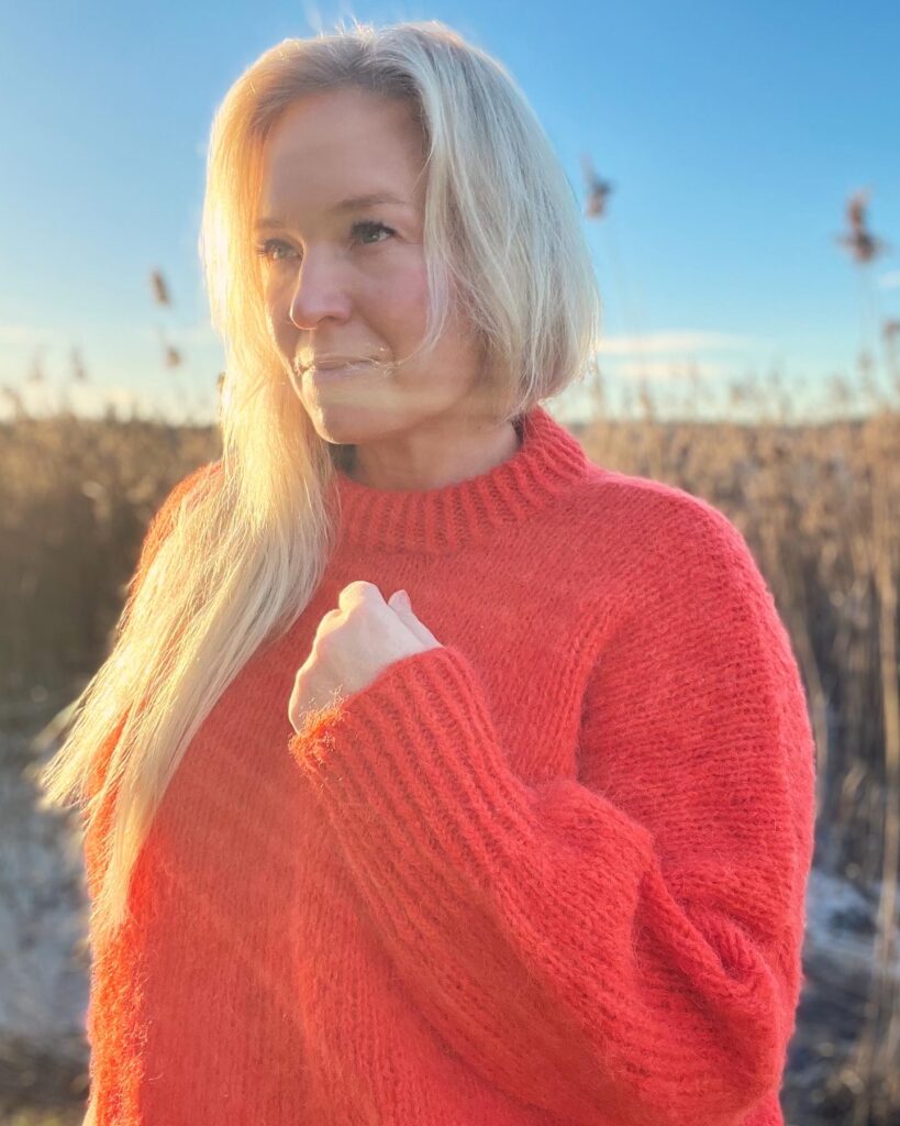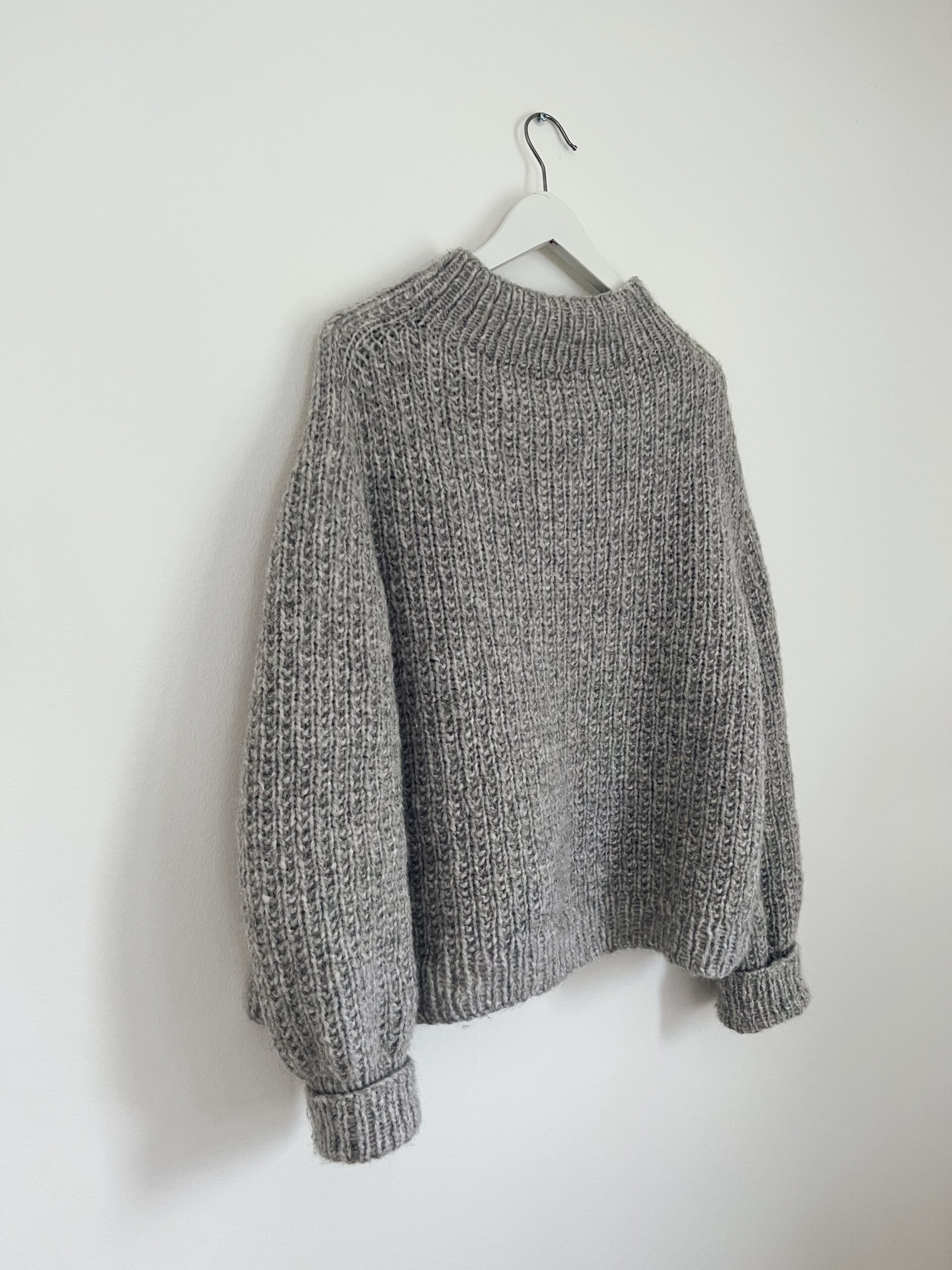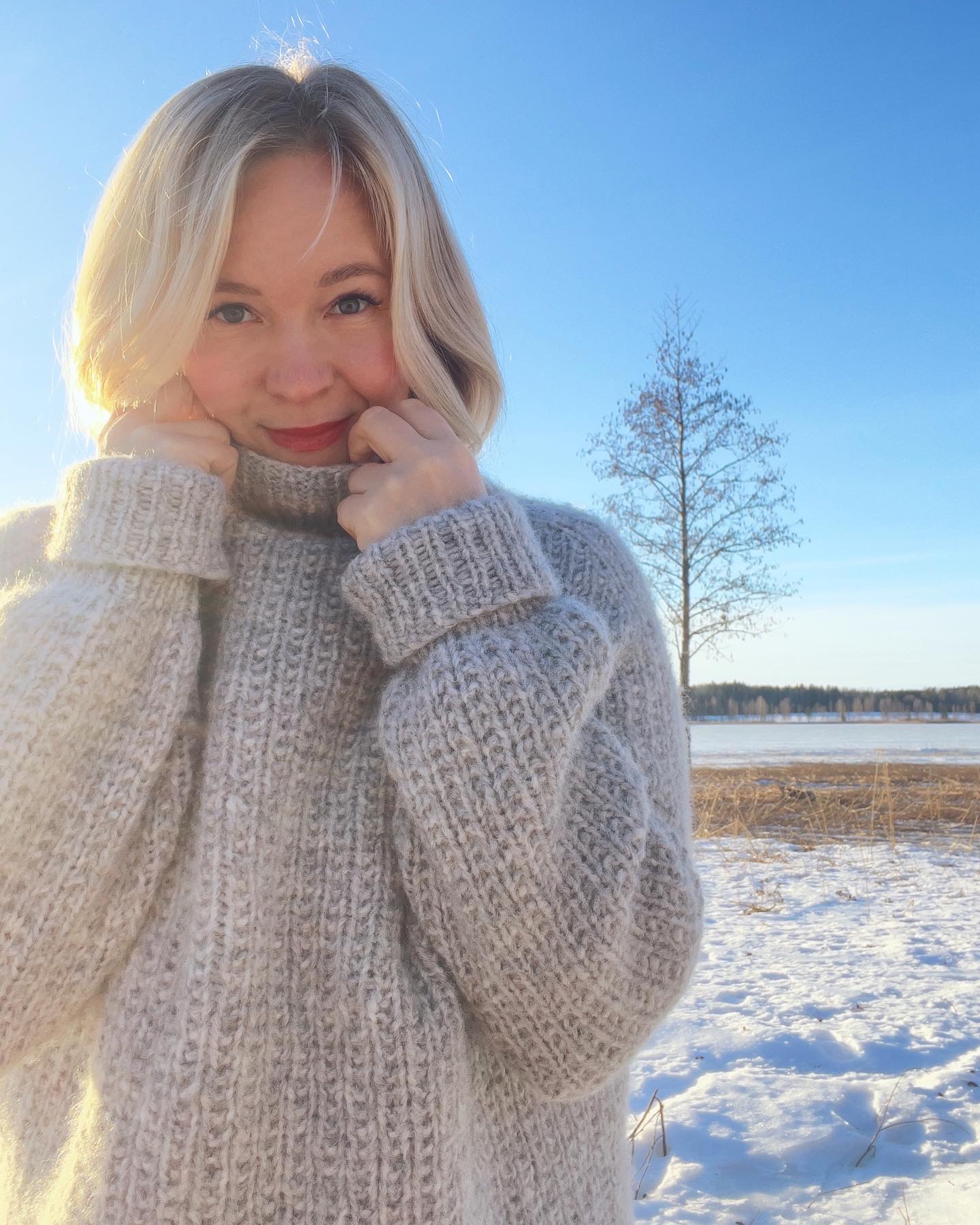Vaikka lanka on paksua pusero on kevyt ja neulos ilmavaa. Keskimmäiseen kokoon tarvitset ainoastaan 350g lankaa.