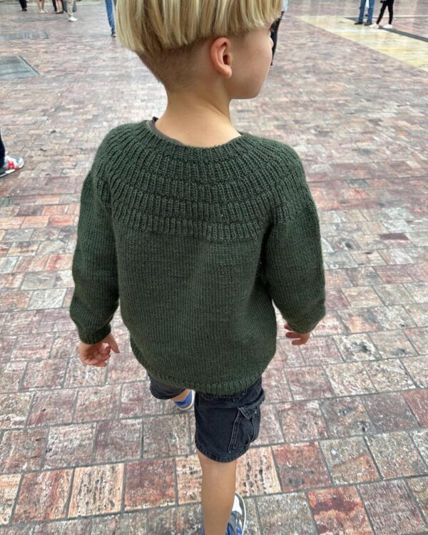 Vihreä pusero on neulottu Sandnes Garnin Peer Gyntillä värissä 9581 PetiteKnit Pine, joka on poistunut väri. Lähimpänä valikoimastamme on Peer Gynt värissä 9572 Meleerattu tummanvihreä.