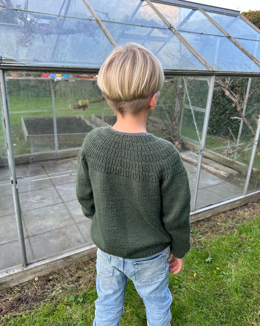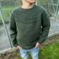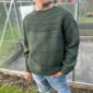 Vihreä pusero on neulottu Sandnes Garnin Peer Gyntillä värissä 9581 PetiteKnit Pine, joka on poistunut väri. Lähimpänä valikoimastamme on Peer Gynt värissä 9572 Meleerattu tummanvihreä.