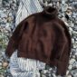 Tummanruskea pusero on neulottu Peer Gyntin värillä 3091 PetiteKnit Cacao Nibs.