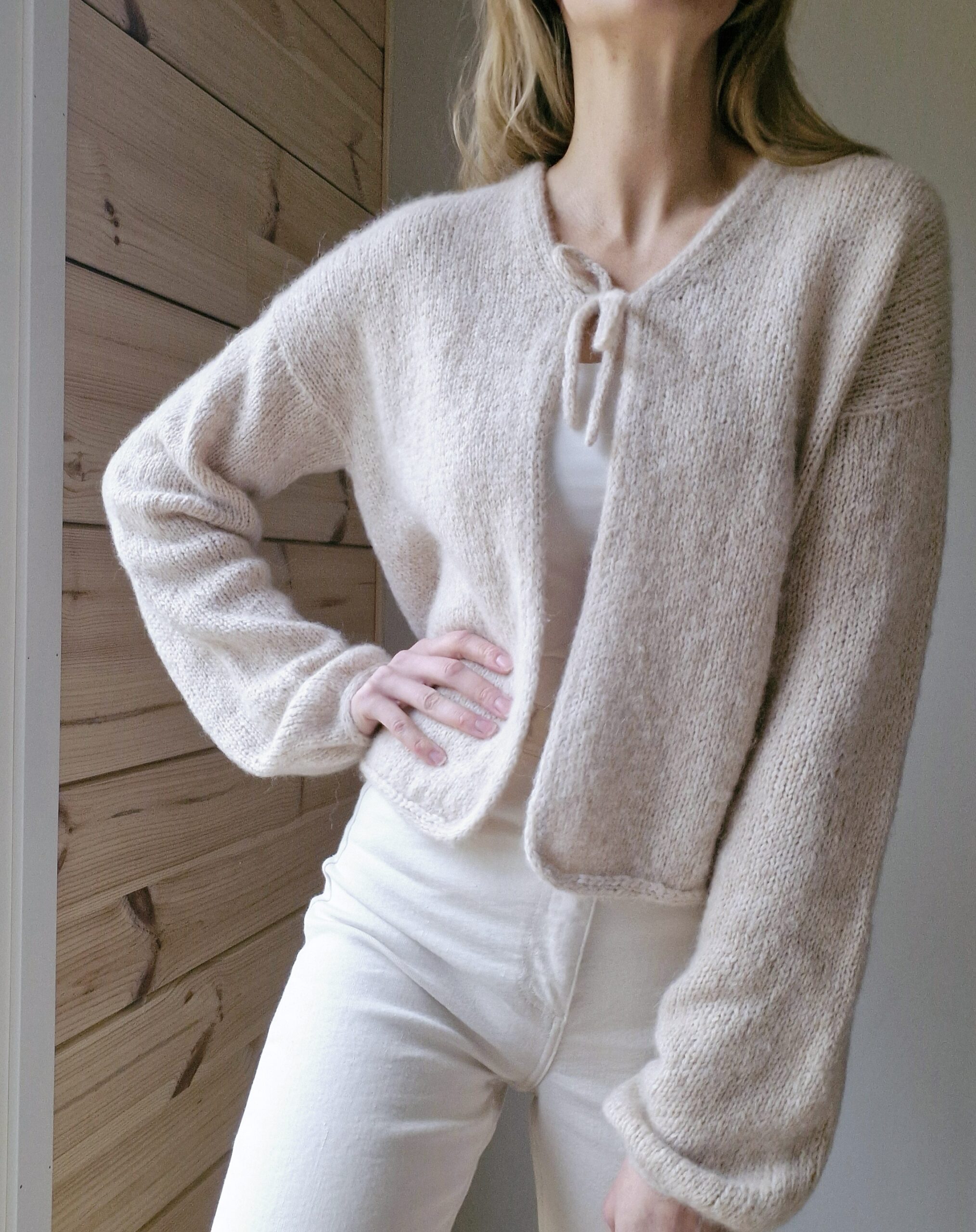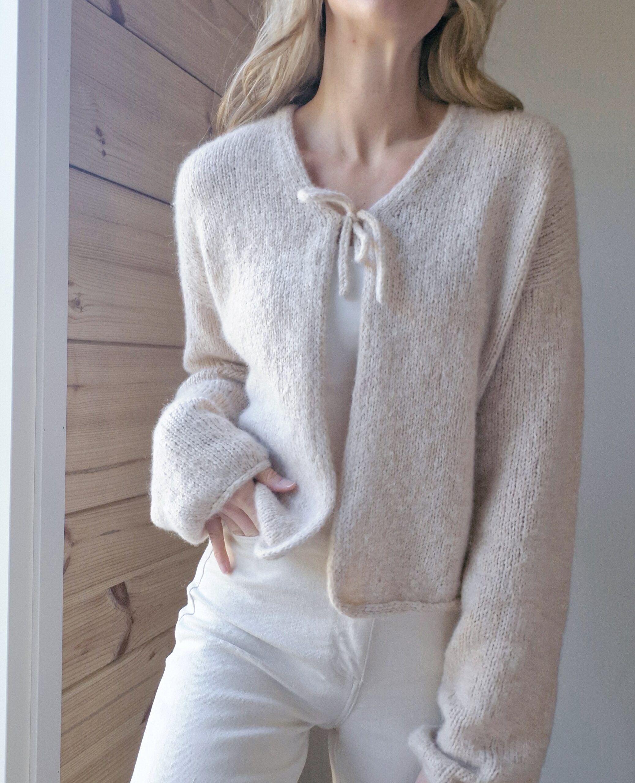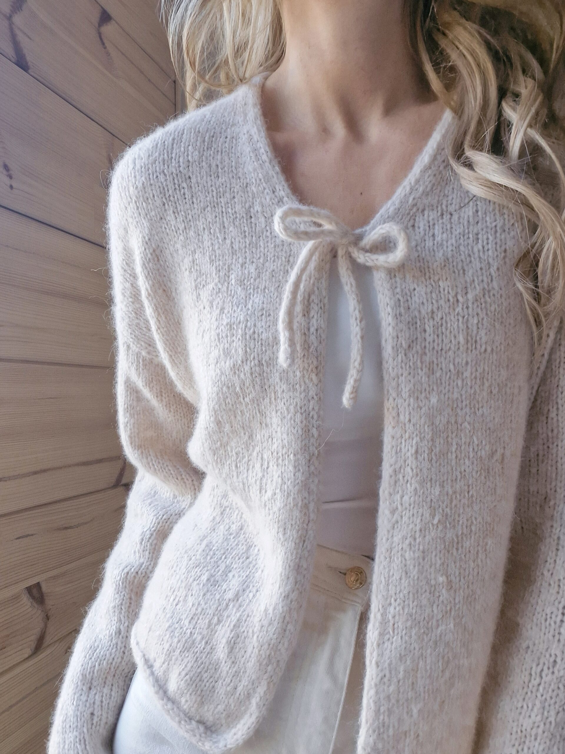 Kuvien neuletakki on neulottu Dropsin langoilla, jotka eivät valitettavasti kuulu valikoimaamme. Lähimpänä valikoimastamme on Sandnes Garn Kos värissä 3532 Beige.