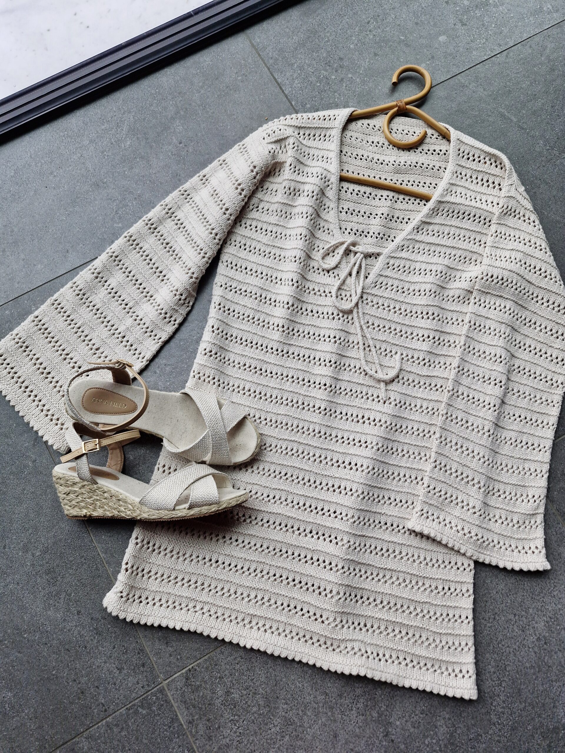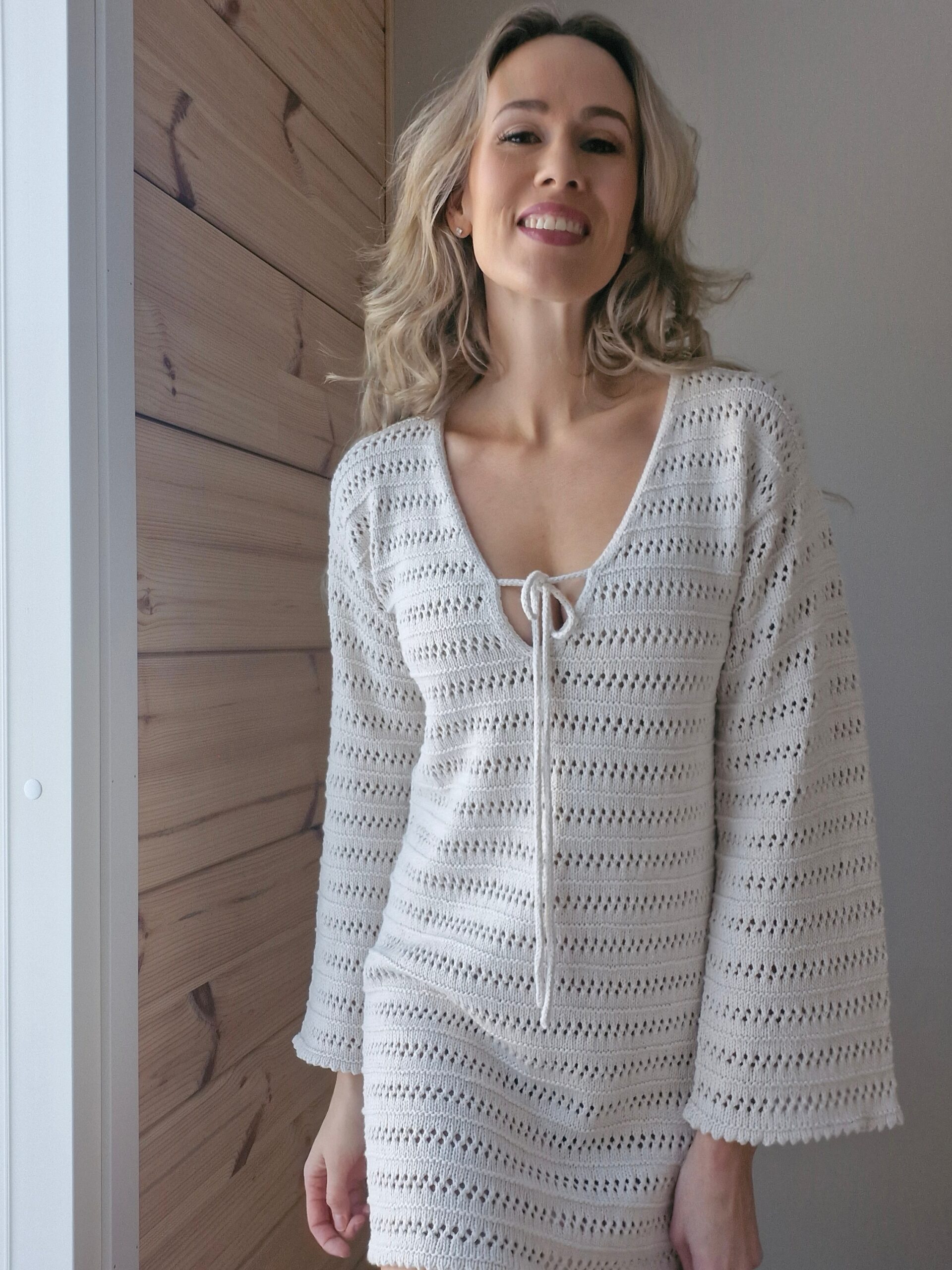 Emma-neulemekko on kesän näyttävin neuleluomus, joka sopii asustaen kaikkiin tapahtumiin arjesta juhlaan. Tässä neulemekossa näytät tyylikkäältä niin kesäjuhlissa, juhannuksena, festareilla, rannalla kuin arkiriennoissa. Herkkä pitsineulos, leveät hihat ja syvä v-pääntie tekevät Emma-mekosta todellisen katseenkääntäjän.