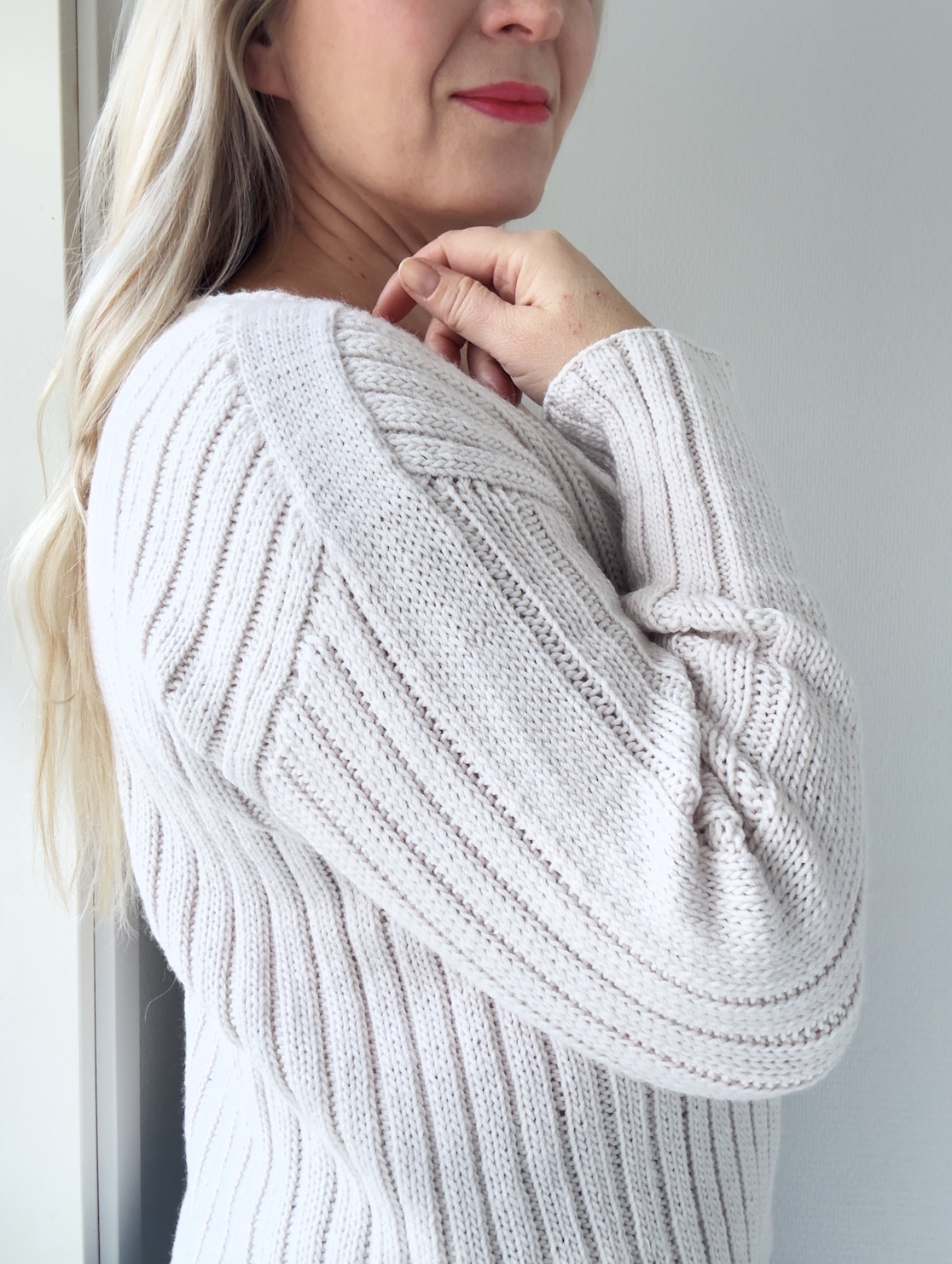 Suositeltu väljyys: 10 cm suunniteltua väljyyttä, joten valitse koko, joka on n. 10 cm suurempi kuin oma rinnanympäryksesi (tai levein kohta). Jos haluat napakamman neuleen, valitse koko, jonka rinnanympärys on lähempänä omaasi.