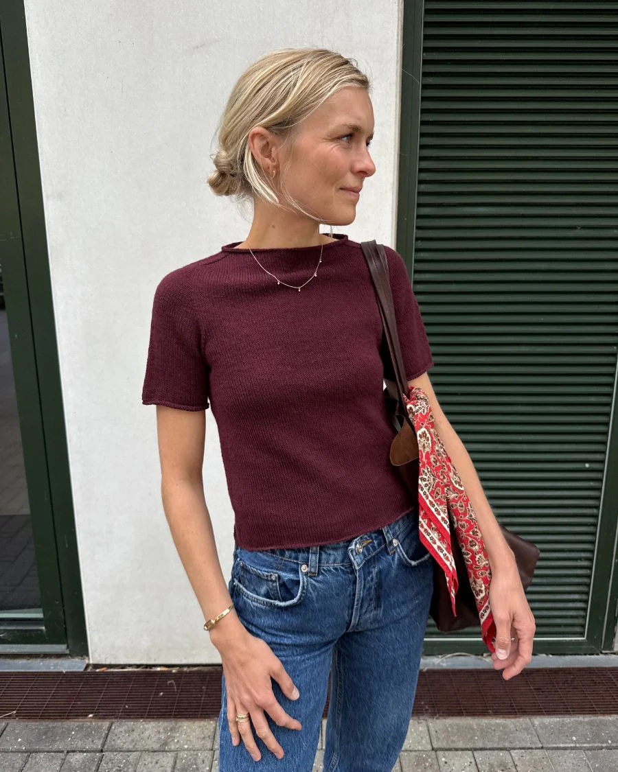 Kuvien burgundi pusero on neulottu Sandnes Garn Sunday värillä 4372 syvä burgundi.