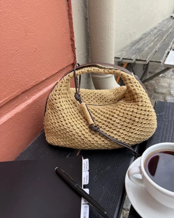Vaaleanruskea ja tummaruskea laukku on neulottu Lang Yarnsin sekä Isagerin langoilla, jotka eivät valitettavasti kuulu valikoimaamme. Lähimpänä valikoimastamme on Tynn Line värissä 3021 beige sekä 3161 tammenterho.