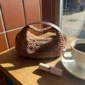 Vaaleanruskea ja tummaruskea laukku on neulottu Lang Yarnsin sekä Isagerin langoilla, jotka eivät valitettavasti kuulu valikoimaamme. Lähimpänä valikoimastamme on Tynn Line värissä 3021 beige sekä 3161 tammenterho.