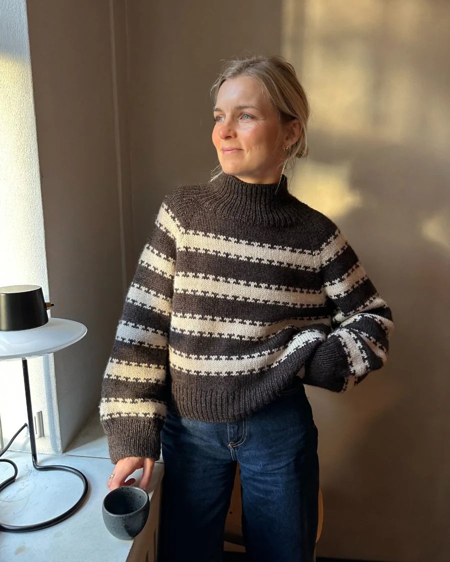 Valkoruskea mallikappale on neulottu Filcolanan langoilla, jotka eivät valitettavasti kuulu valikoimiimme. Lähimpänä on väreistä on Peer Gyntin värit PetiteKnit Cacao Nibs [3091] ja luonnonvalkoinen [1012] yhdessä Alpakka Følgetrådin väreillä Cacao Nibs [3091] ja Marsipaani [2321].