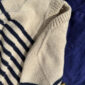 Langat ja paperinen ohje ylhäältä alas neulottavaan raitapuseroon. Puseroon tehdään taitettava pääntien reunus.