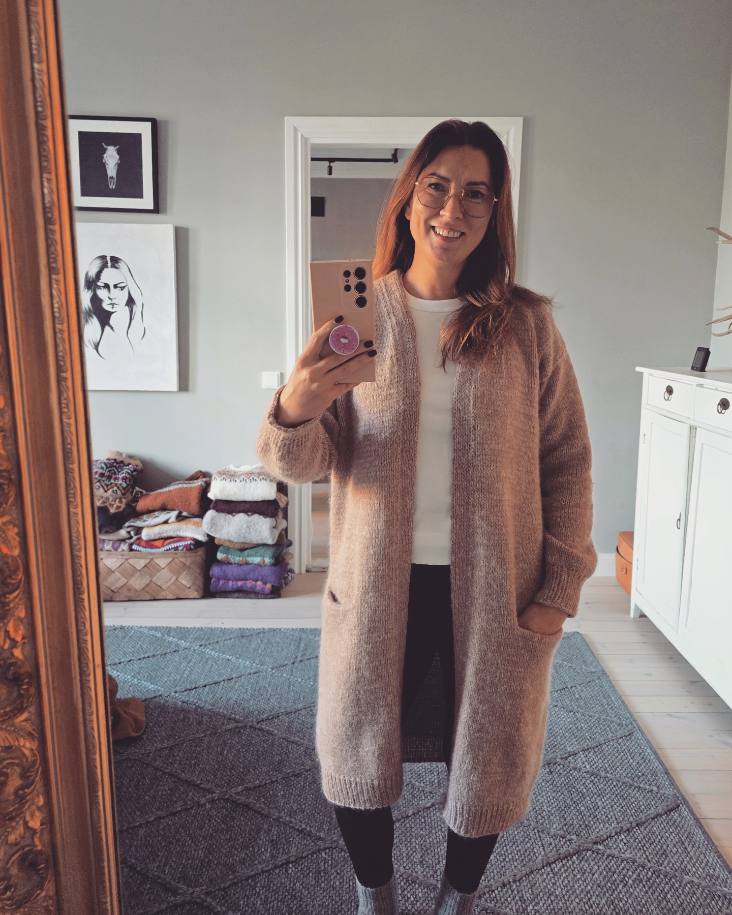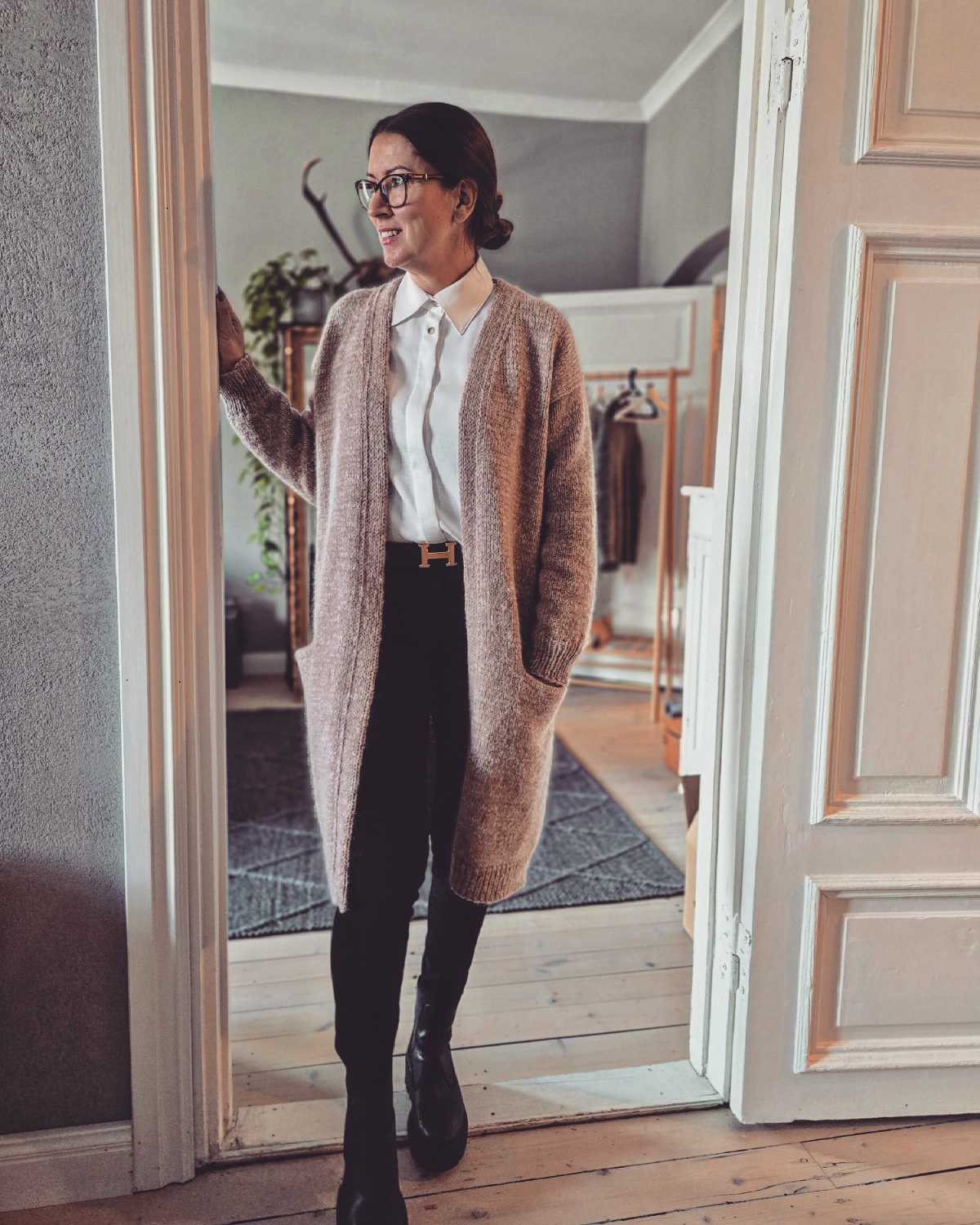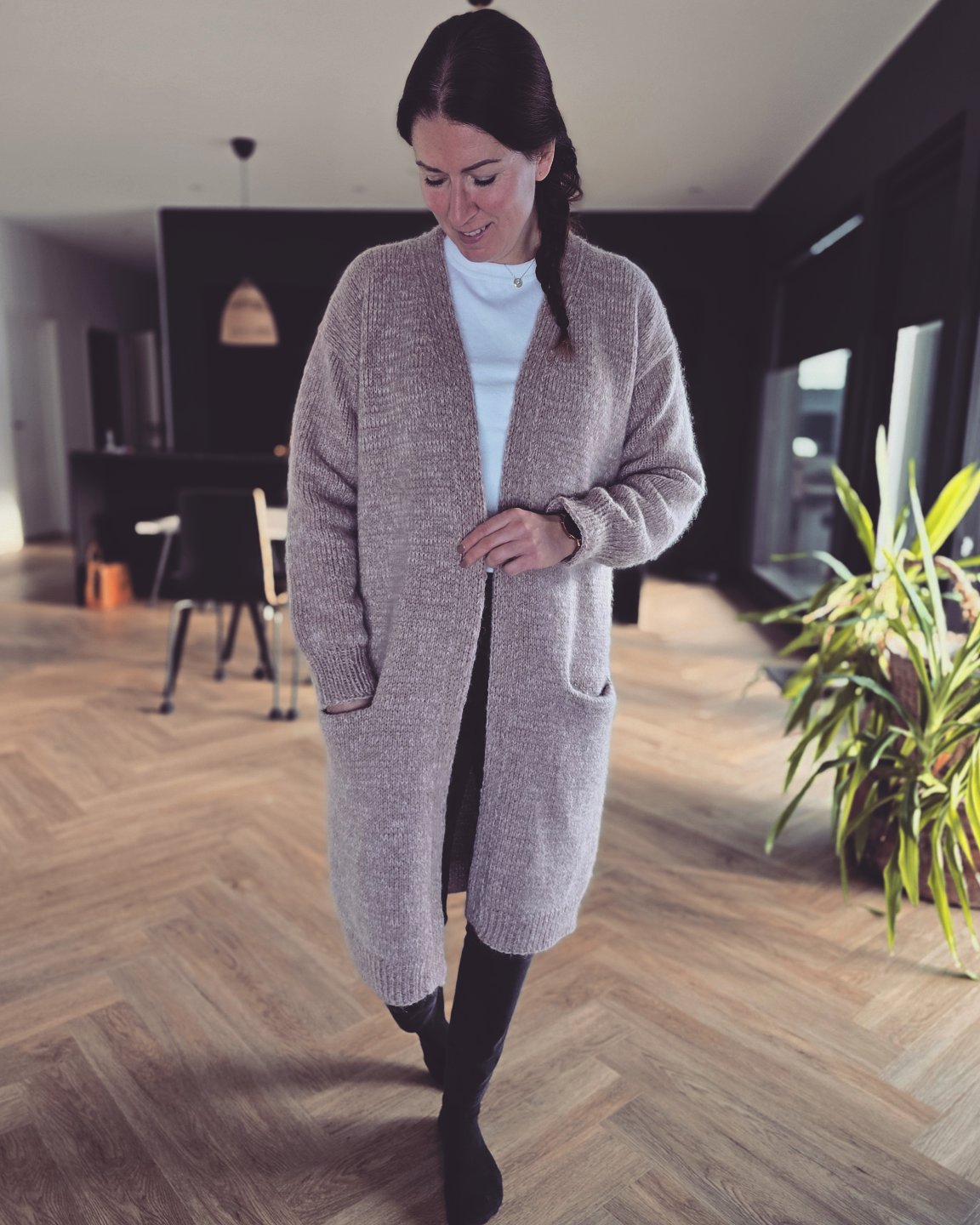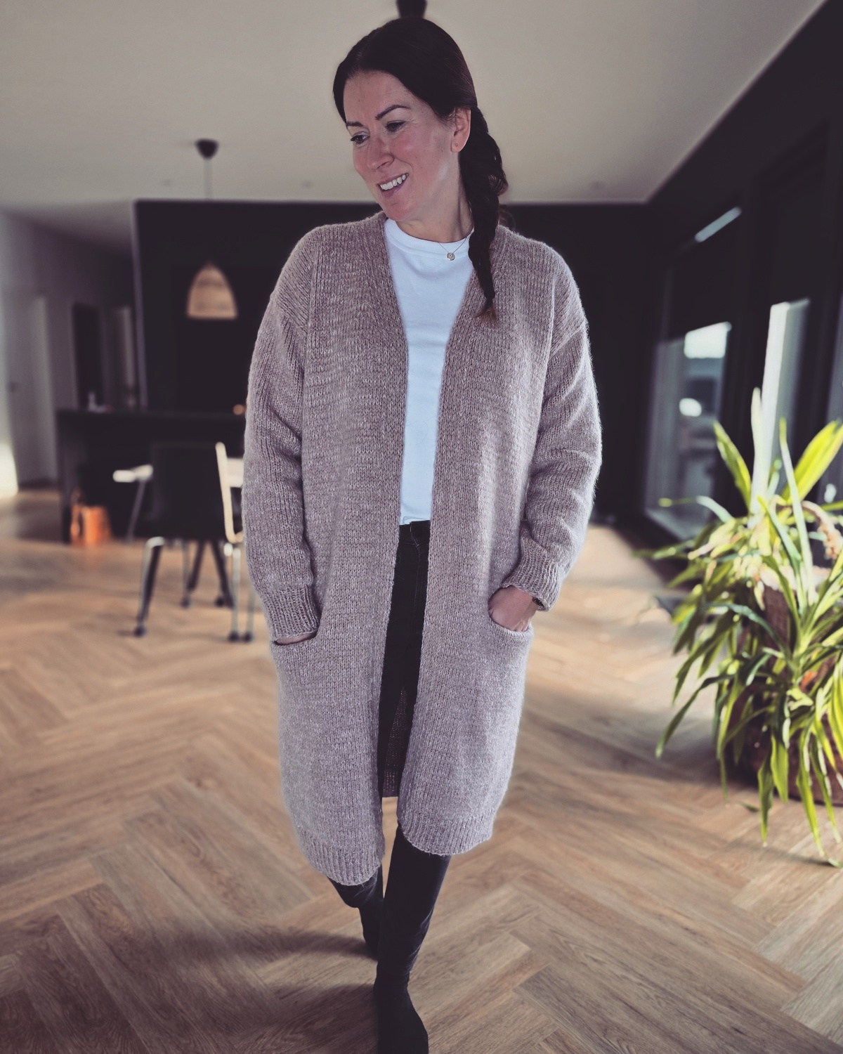 Muusa on rento ja pitkä neuletakki, jossa on käytännölliset taskut. Takki neulotaan kahdella langalla, joista toinen on ohut merinovillalanka ja toinen pörröinen silkki-mohair-lanka. Näiden lankojen yhdistelmänä neuloksesta tulee eläväinen, ihanan pehmeä ja laskeutuva eikä se juurikaan nyppäänny käytössä.