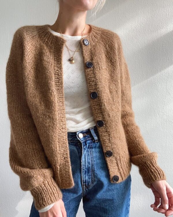Novice Cardigan – Chunky Edition on neulottu Sandnes Garnin Kos värillä 2543 Ruskea sokeri sekä Tynn Silk Mohairin värillä 2543 ruskea sokeri. Värit ovat valitettavasti poistuneet valikoimasta, mutta lähimpänä ovat Kos värissä 2573 Munkki ja Tynn Silk Mohair värissä 3342 mokkamousse.