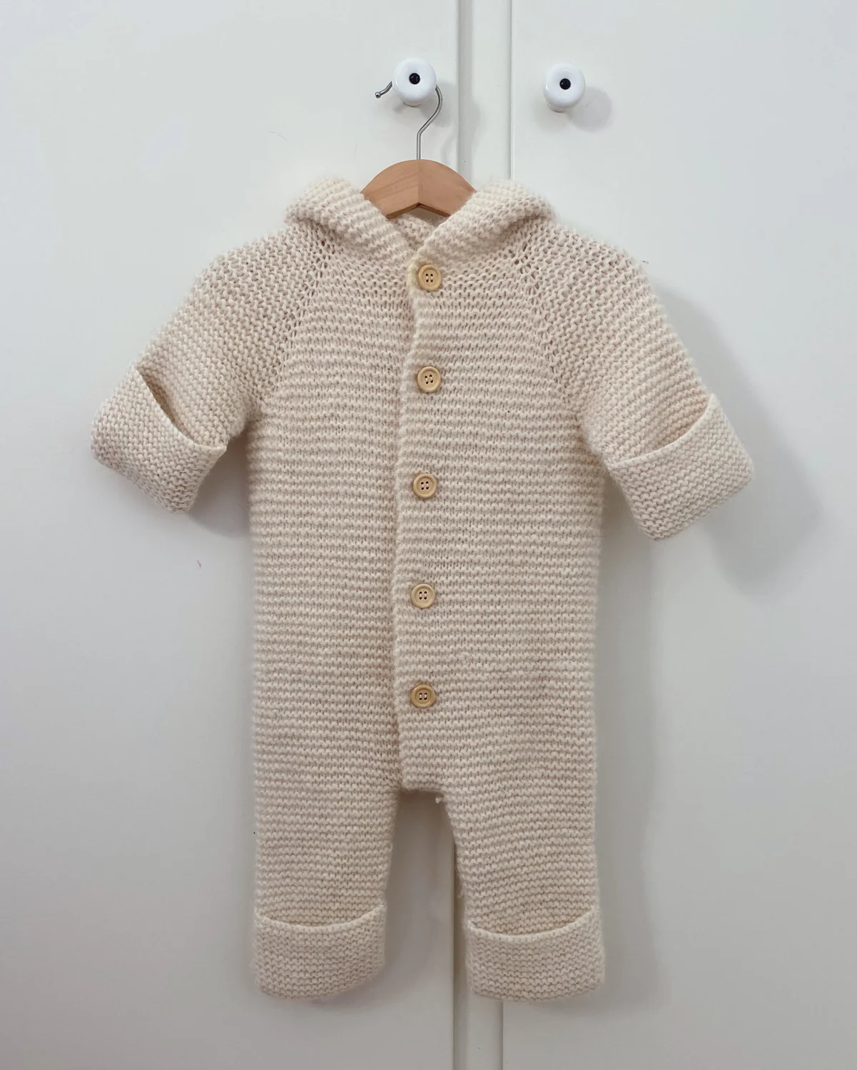 Selma’s Sleep Suit neulotaan aina oikein -neuleena ylhäältä alas hupusta aloittaen. Kaarroke muotoillaan raglanlisäyksin. Hihojen ja lahkeiden päät voi taittaa auki tai pitää suljettuina.