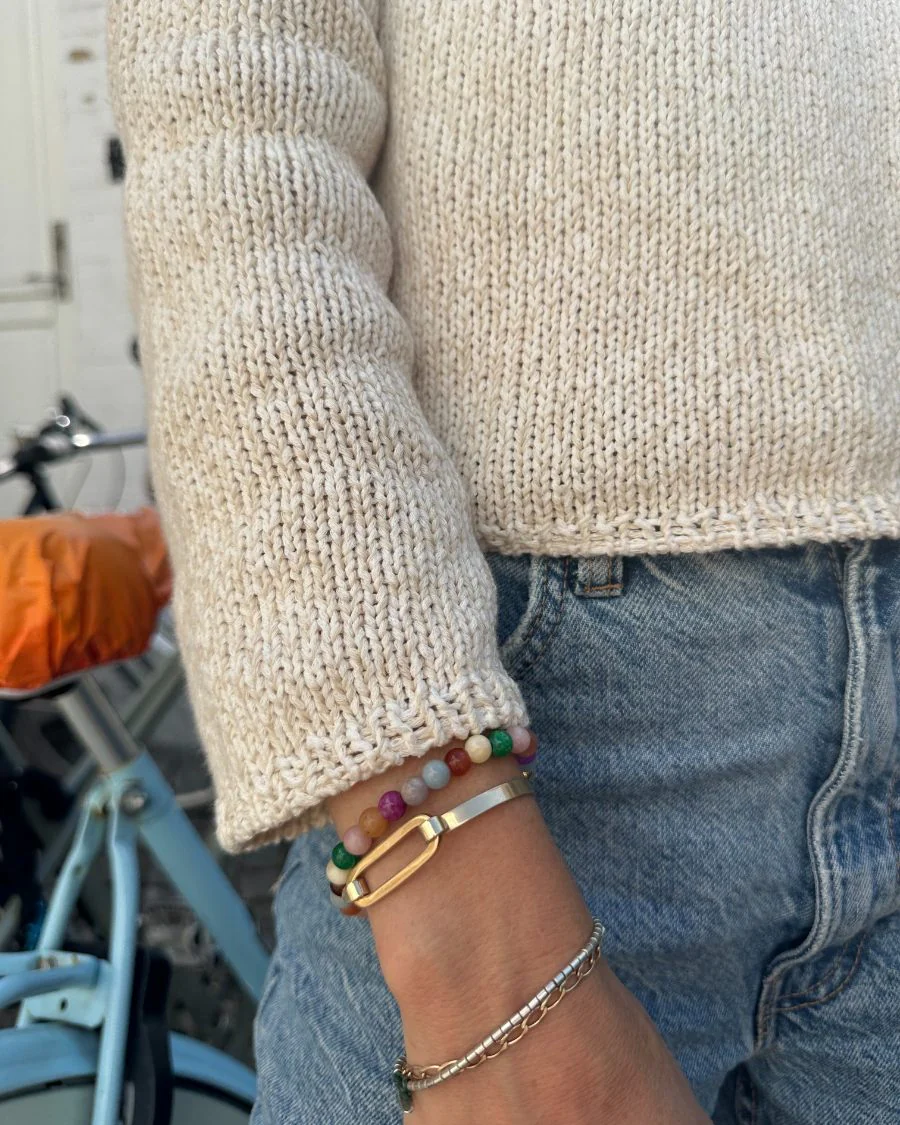 Vaalea pusero on neulottu Isagerin langoilla, jotka eivät valitettavasti kuulu valikoimaamme. Lähimpänä valikoimastamme on Sandnes Garn Line värissä 1015 kitti sekä Tynn Line värissä 1015 kitti.