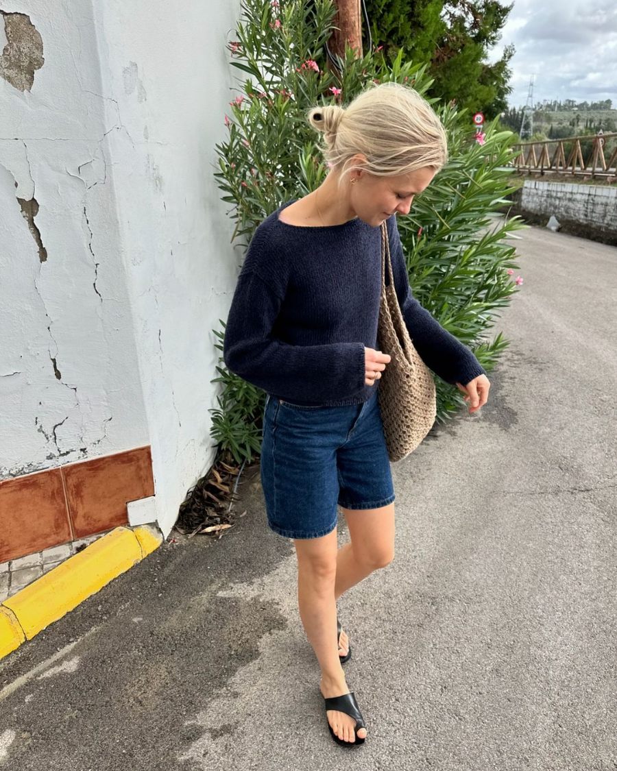 Tummansininen pusero on neulottu Isagerin langoilla, jotka eivät valitettavasti kuulu valikoimaamme. Lähimpänä valikoimastamme on Sandnes Garn Line värissä 5863 blueprint sekä Tynn Line värissä 6061 tumma harmaansininen.