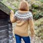 Keltainen Sipoonkorpi Bulky -pusero on neulottu Álafosslopi-langan 9964 kullankeltainen, 0051 valkoinen, 9967 sinivihreä, 0057 harmaa ja 1409 granaattiomena.