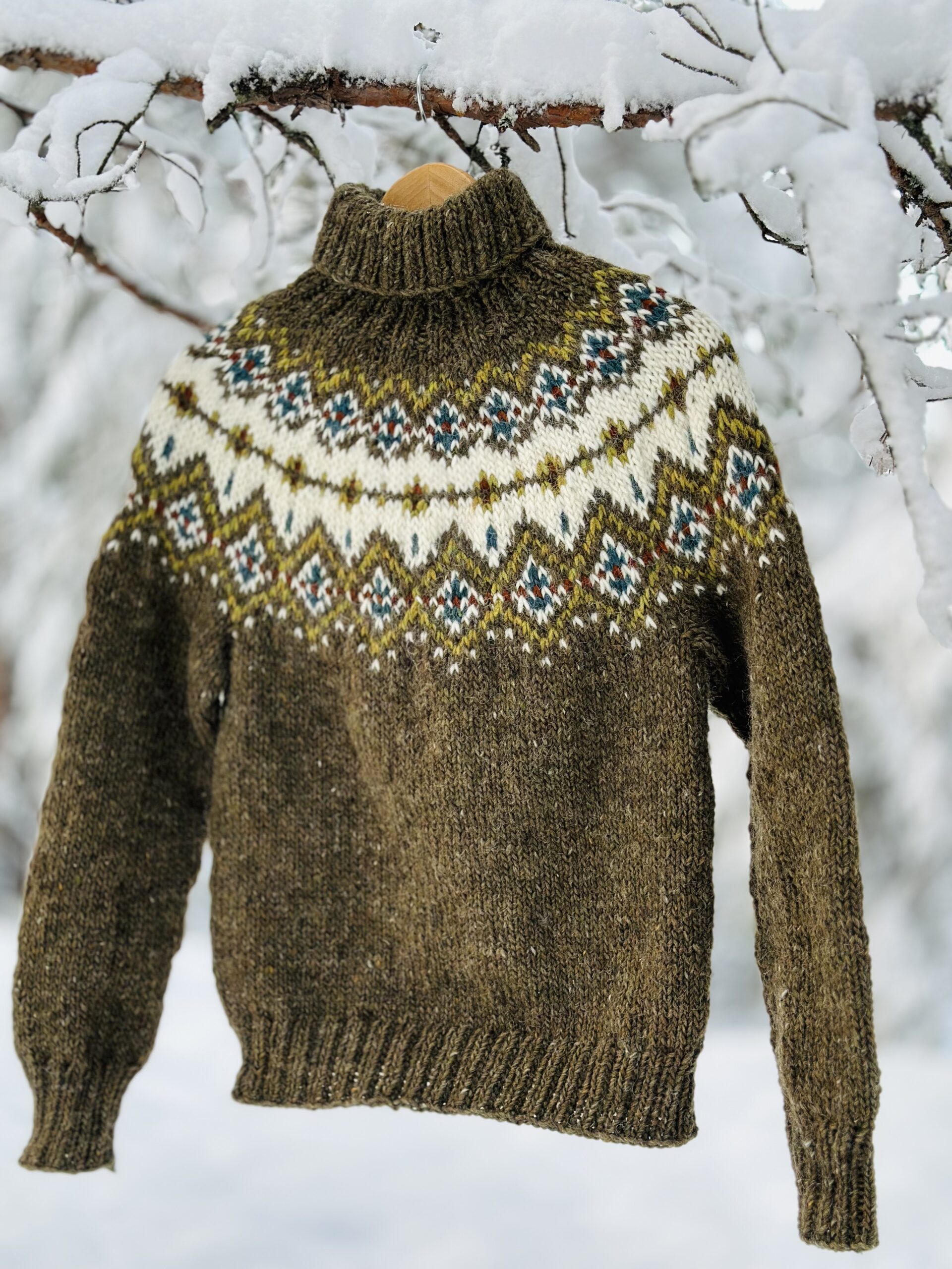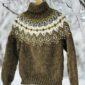 Vihreä Sipoonkorpi Bulky-pusero on neulottu Álafosslopi-langan väreillä 1230 Ylämaanvihreä, 0051 valkoinen, 9965 keltavihreä, 9967 sinivihreä, 9427 ruosteenruskea.