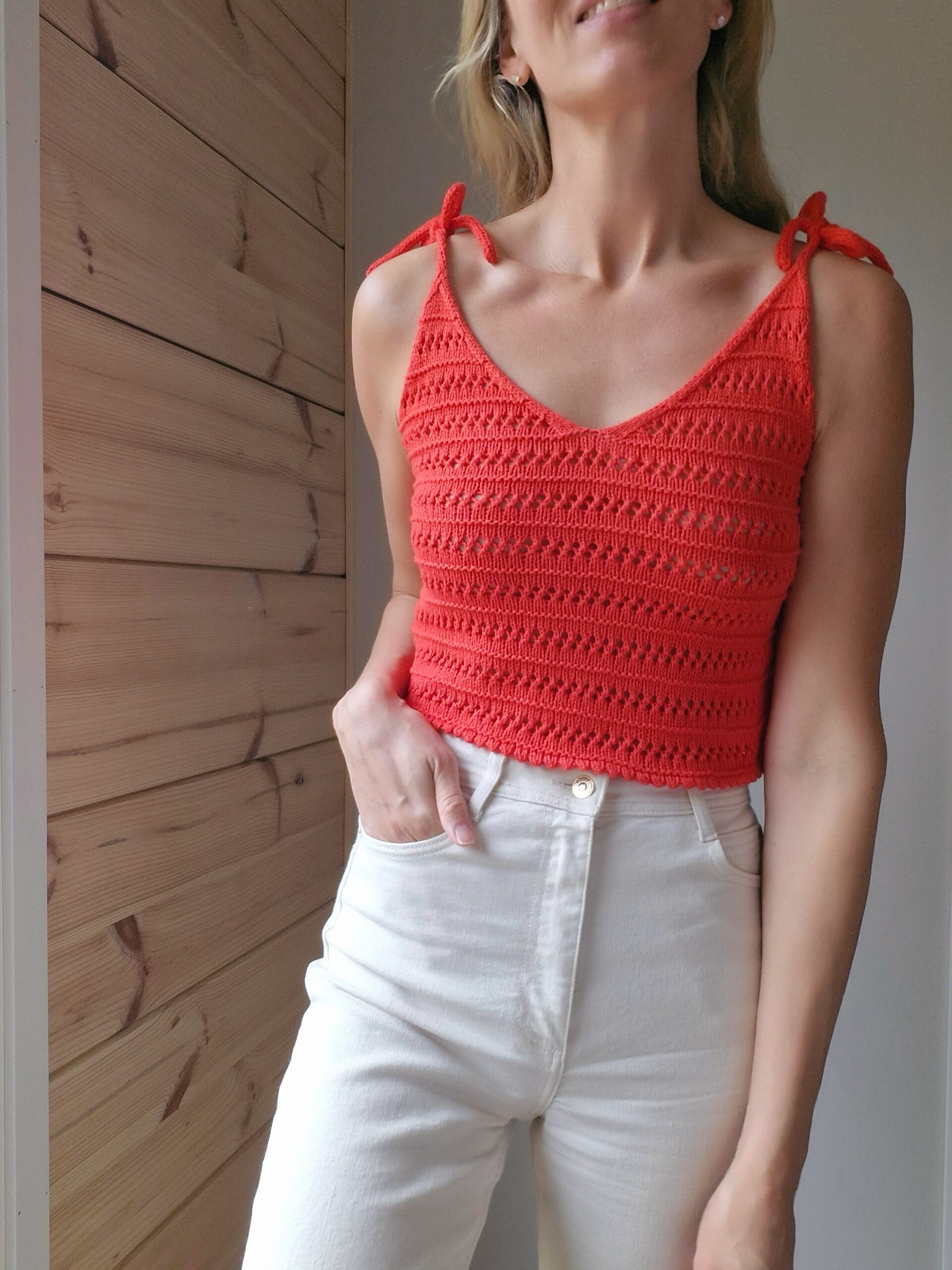 Mittaa rinnanympäryksesi ja vertaa mittaasi taulukossa annettuihin valmiin neuleen mittoihin. Valitse koko, joka on 0-5 cm pienempi kuin oma rinnanympäryksesi on. Mallin rinnanympärys on 90 cm. Molemmat topit on neulottu S-koossa. Negatiivista väljyyttä on 6 cm. Voit halutessasi valita myös väljemmän koon. Valkoinen toppi on neulottu ohjeen mukaan normaalipituisena. Punainen toppi on 6 cm ohjetta lyhyempi.